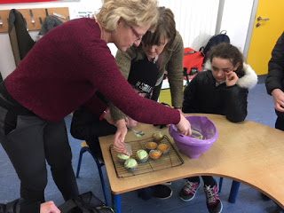 We made iced buns last Wednesday and added some green food colouring to the icing (it's nearly St. Patrick's Day after all)! Teacher Eoin did his usual trick of buying the cake mixture first!